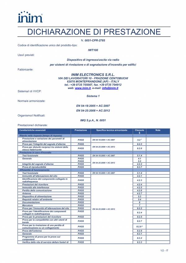 IWT100 - Declaración de las Prestaciones N. 0051-CPR-2785 de 14/11/2025