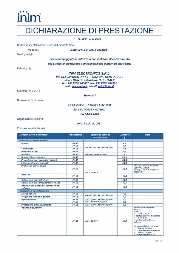 ESB-ES1021-ES2021xE - Dichiarazione di Prestazione N. 0051-CPR-2035 del 14/11/2025