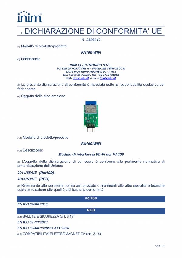 FA100-WIFI - Dichiarazione di conformità UE N. 2508019 del 01/08/2025