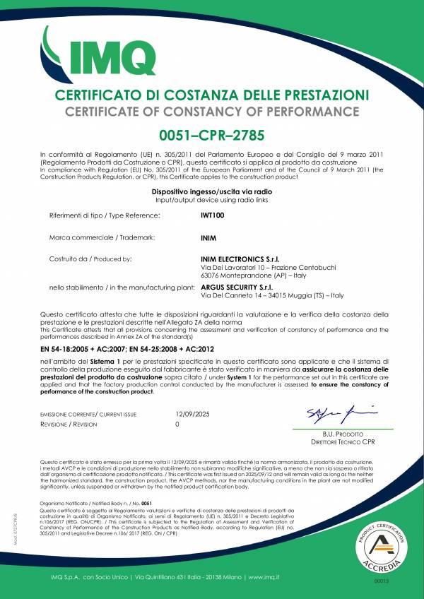 IWT100 - Certificato di Costanza della Prestazione IMQ N. 0051-CPR-2785 del 12/09/2025