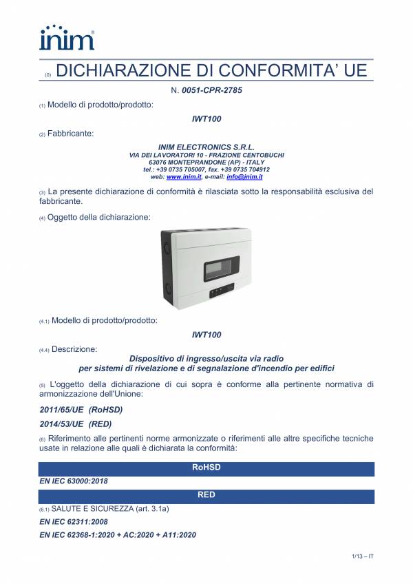 IWT100 - Dichiarazione di Conformità UE N. 0051-CPR-2785 del 03/10/2025
