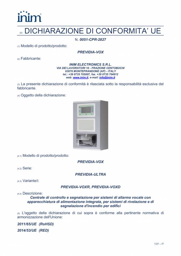 Previdia-Vox - Dichiarazione di Conformità UE N. 0051-CPR-2827 del 31/10/2025