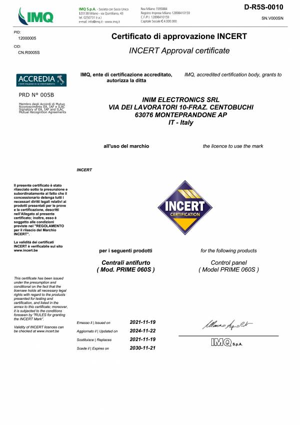 Prime060S - Certificato di Approvazione INCERT N. D-R5S-0010 del 22/11/2024
