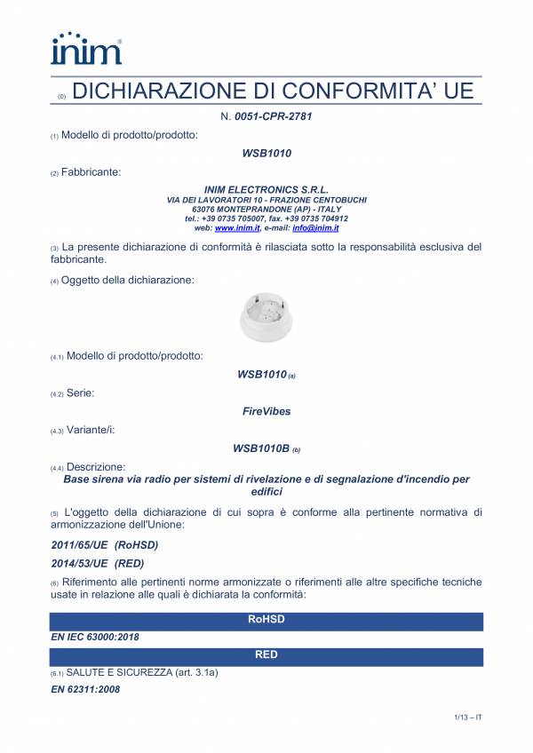 WSB1010 - Dichiarazione di Conformità UE N. 0051-CPR-2781 del 03/10/2025