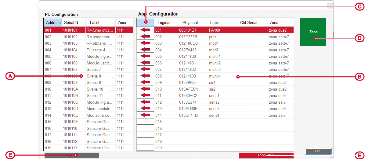 Proceeding to the next step, the software communicates with the control panel and scans the loop to verify that the connected devices can actually be seen by the control panel. Now on the left you see the list of devices added via the “Class” function and on the right the devices read from the real loop.