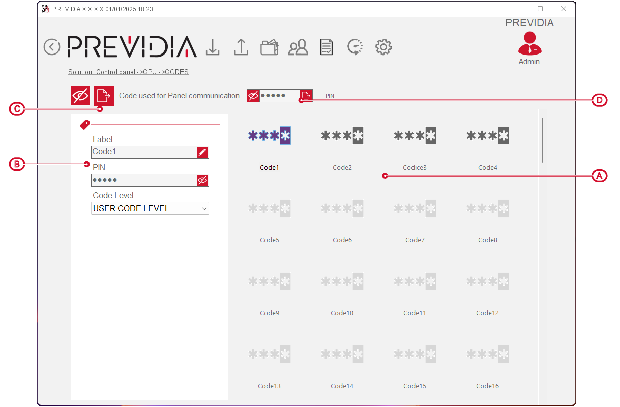 There is also a field [D] for entering the PIN to attribute to the Previdia/STUDIO software. This code defines the level of access of the software to the control panel. By default it is “0004”, therefore enabled for programming.