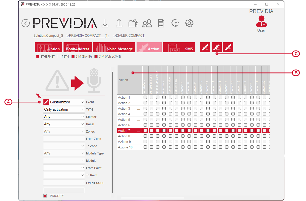 The software provides the “Actions” subsection with a matrix where you can add actions and associate them with contacts: