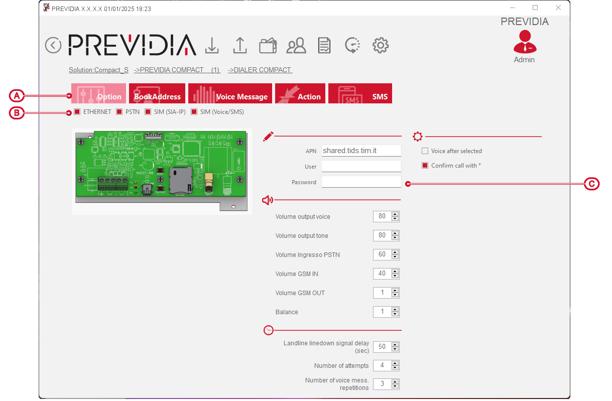 The control panel manages the telephone communication channels via the PREVIDIA-C-DIAL accessory card, the programming of which is accessible via the specific button, reachable from the control panel programming page.