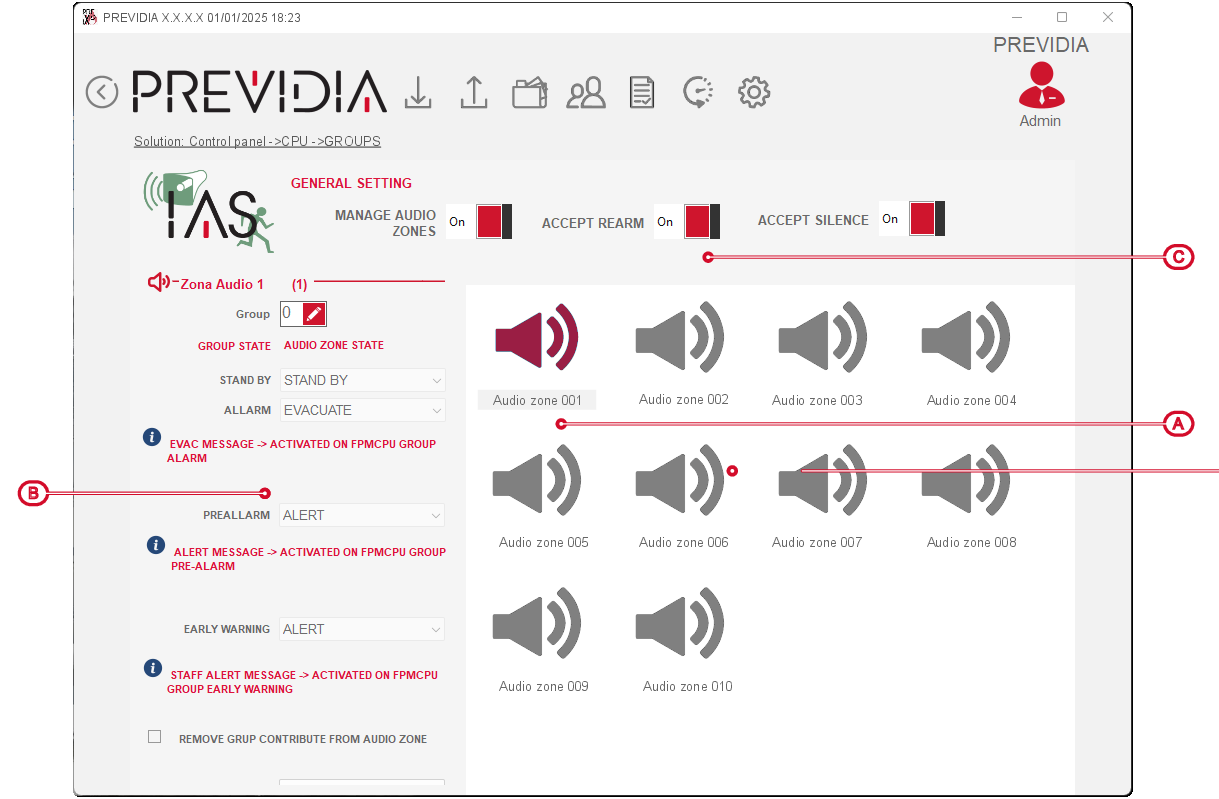 The top section [C] Previdia/STUDIO allows you to set up the functions of the voice emergency system that can be reproduced on the fire system: