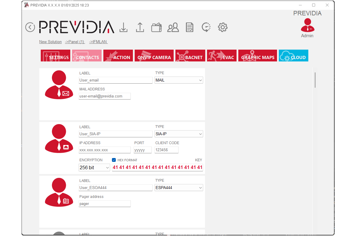 E-mail – contacts of this type will be the recipients of emails that are sent by the control panel following certain conditions, as foreseen by programming.