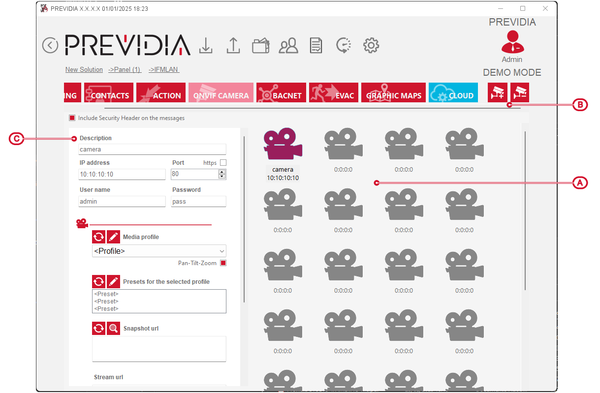 Control panels from the Previdia series are capable of capturing images from IP cameras equipped with ONVIF. These images can be displayed on screens or forwarded from a remote location via e-mail to provide the end-user with a clear understanding of what is happening in the environment signalling the alarm.