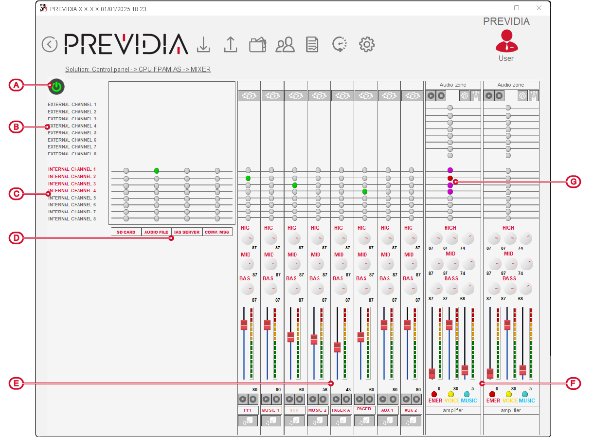 On the right [F] the mixer shows the output channels, with as many sections as configured IFAMAMP modules placed side by side, identified by their description and the associated audio zone.