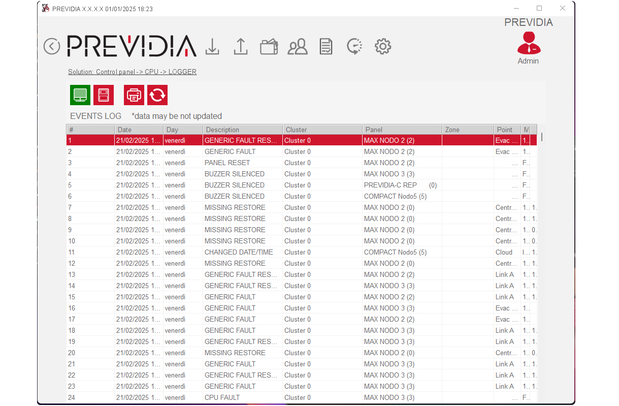 The Previdia control panel can record up to 2000 events. If this limit is exceeded, the latest events will be recorded and will overwrite the oldest events. The Previdia/STUDIO software can save up to 20,000 events. It is possible, therefore, to access both memories via the appropriate buttons:
