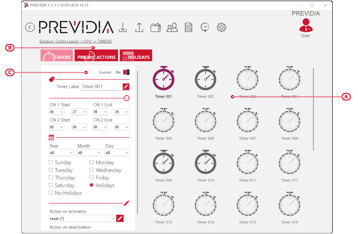 A timer is a function for managing events and procedures based on hours, dates, or recurrences (weekdays or holidays).