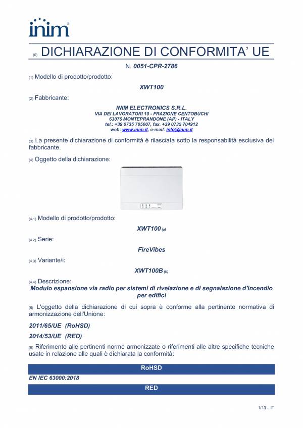 XWT100 - Declaração de Conformidade UE N. 0051-CPR-2786 de 03/10/2025